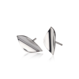 Sølvøredobber på stift laget som små blanke konkave blad liggende på øreflippen. Øredobbene er saget ut for hånd og formet før det er loddet på en ørestift.
