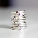Lag din egen kombinasjon av stableringer i sølv. Du kan velge mellom matt og blank overflate. Matteringen gjør at overflaten ser lysere ut, mens reflaksjonen i den blanke overflaten gjør den mørkere. Ringskinnen er 2,5 mm og det er samme størrelse på stenene. Alternative stener er ametyst (to forskjellige lilla nyanser), spinell (sort), topas (blank og tre ulike blå farger), røykkvarts (brun), safir (dus mosegrønn eller rosa), peridot (lys grønn), citrin (oransje), granat (rød) og tanzanite (lys blå-lilla).