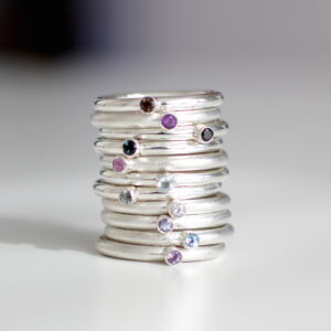 Lag din egen kombinasjon av stableringer i sølv. Du kan velge mellom matt og blank overflate. Matteringen gjør at overflaten ser lysere ut, mens reflaksjonen i den blanke overflaten gjør den mørkere. Ringskinnen er 2,5 mm og det er samme størrelse på stenene. Alternative stener er ametyst (to forskjellige lilla nyanser), spinell (sort), topas (blank og tre ulike blå farger), røykkvarts (brun), safir (dus mosegrønn eller rosa), peridot (lys grønn), citrin (oransje), granat (rød) og tanzanite (lys blå-lilla).